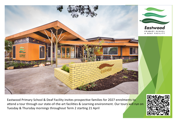 Eastwood Primary School & Deaf Facility invites prospective families for 2027 enrolments to attend a tour through our state-of-the-art facilities & Learning environment. Our tours will run on Tuesday & Thursday mornings throughout Term 2 starting 21 April BOOK HERE